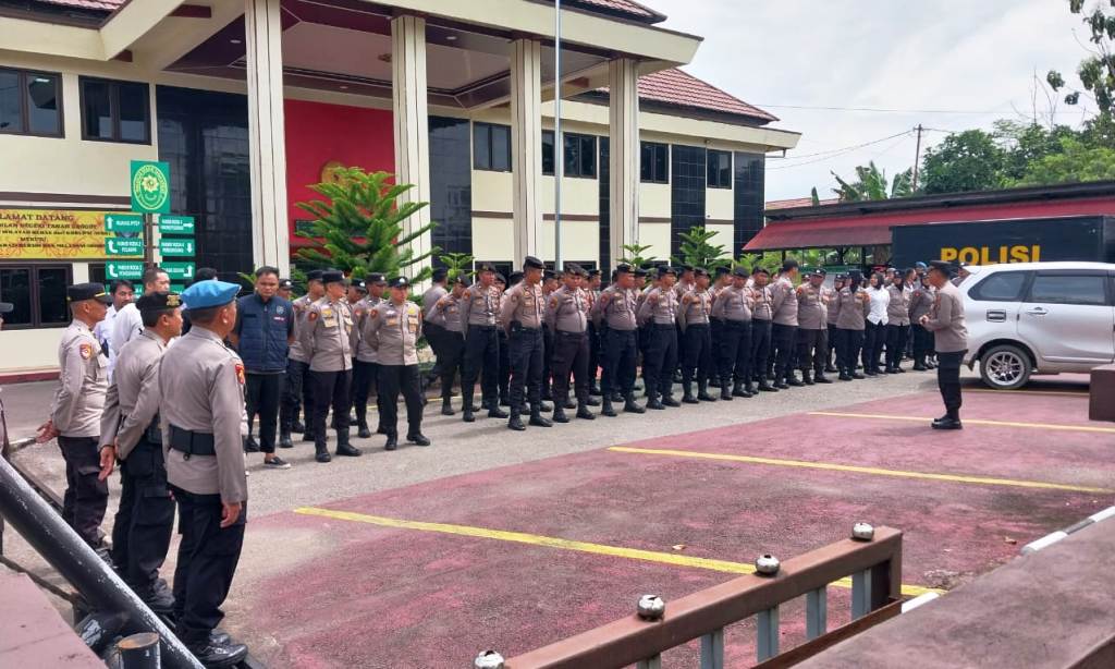 Sejumlah personel kepolisian mengikuti apel pengamanan sebelum sidang perdana kasus pembunuhan warga penolak hauling di Pengadilan Grogot. Foto: Istimewa